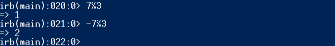 With positive numbers (7%3 = 1) we get results similar to C. However -7%3 => 2. Two important points: The magnitude of the quotient differs and the sign differs (because in ruby the result is given the sign of the second operand). In our example, the floating point result of -7/3 is -2.33. Ruby rounds it down to -3 which is -9/3. So how do you get -7/3? To -9/3 we add 2/3. Thus, the answer is 2.